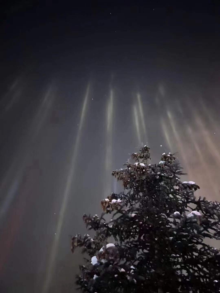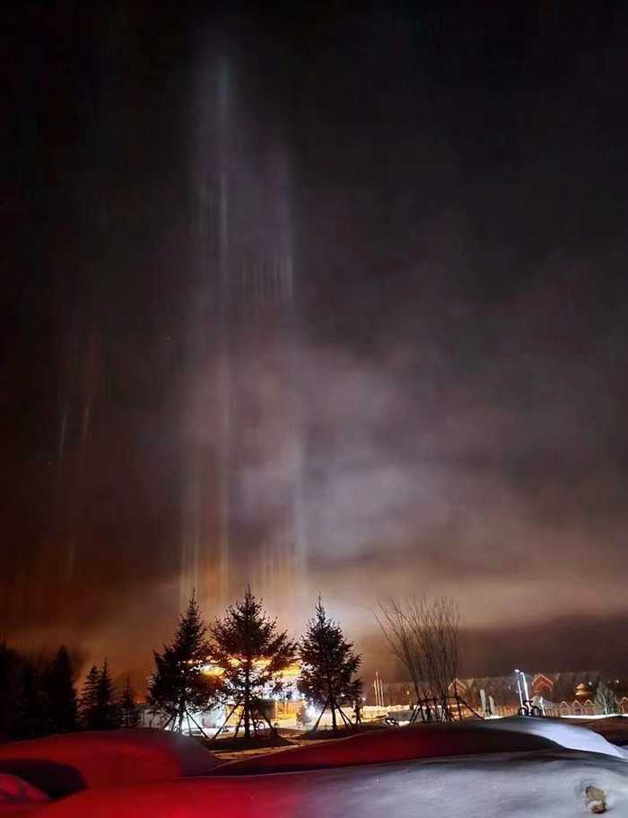 Natural light beams can sometimes be seen on winter nights in cold regions. The rare phenomenon occurs when light meets floating ice particles after snow. The lower the temperature is, the stronger the reflection of the light. On Nov. 27, the lowest temperature in Oroqen Autonomous Banner was about 30 degrees Celsius below zero.