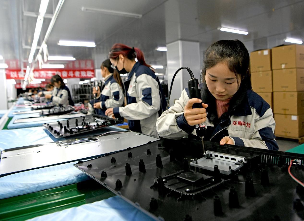 Employees of a company in Huainan, east China's Anhui province manufacture smart display devices, Dec. 18, 2021. (People's Daily Online/Chen Bin)