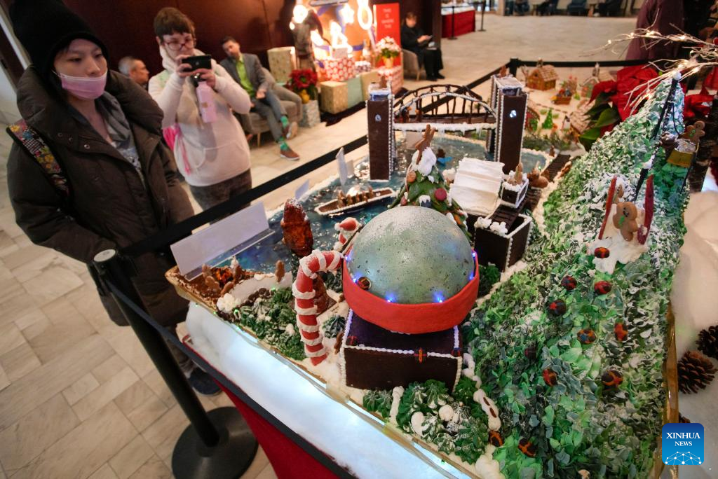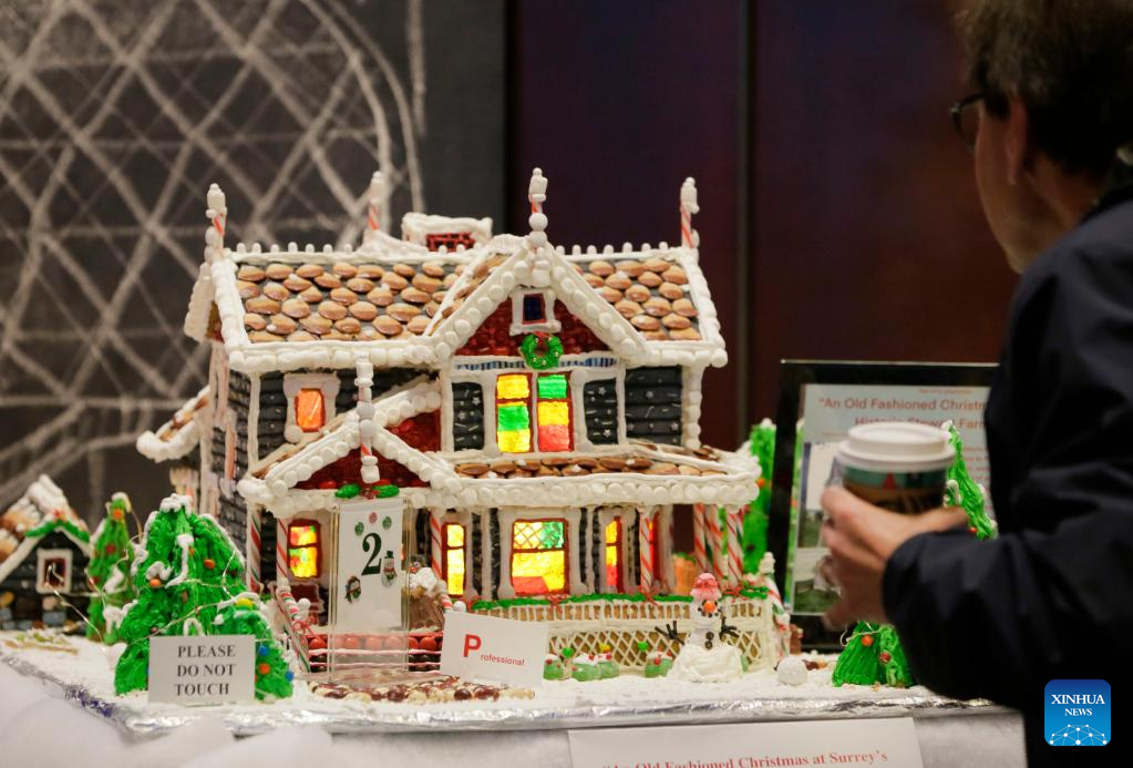 People look at a gingerbread house creation at the 30th Gingerbread Lane event held in Vancouver, British Columbia, Canada, on Dec. 7, 2022. (Photo by Liang Sen/Xinhua)