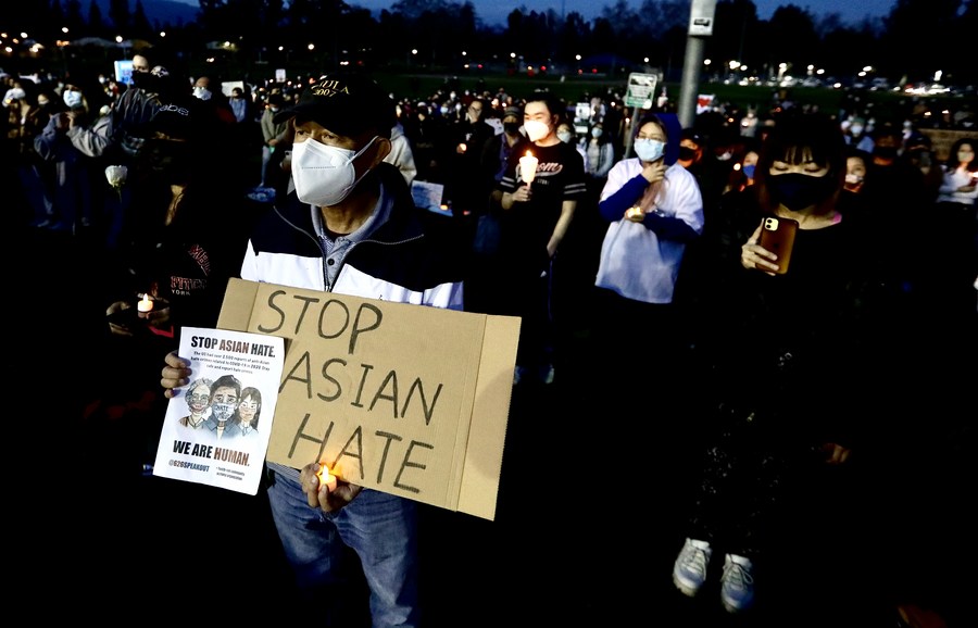 People attend a "Stop Asian Hate" candlelight vigil in a city park of Alhambra, Los Angeles County, California, the United States, March 20, 2021. (Xinhua)