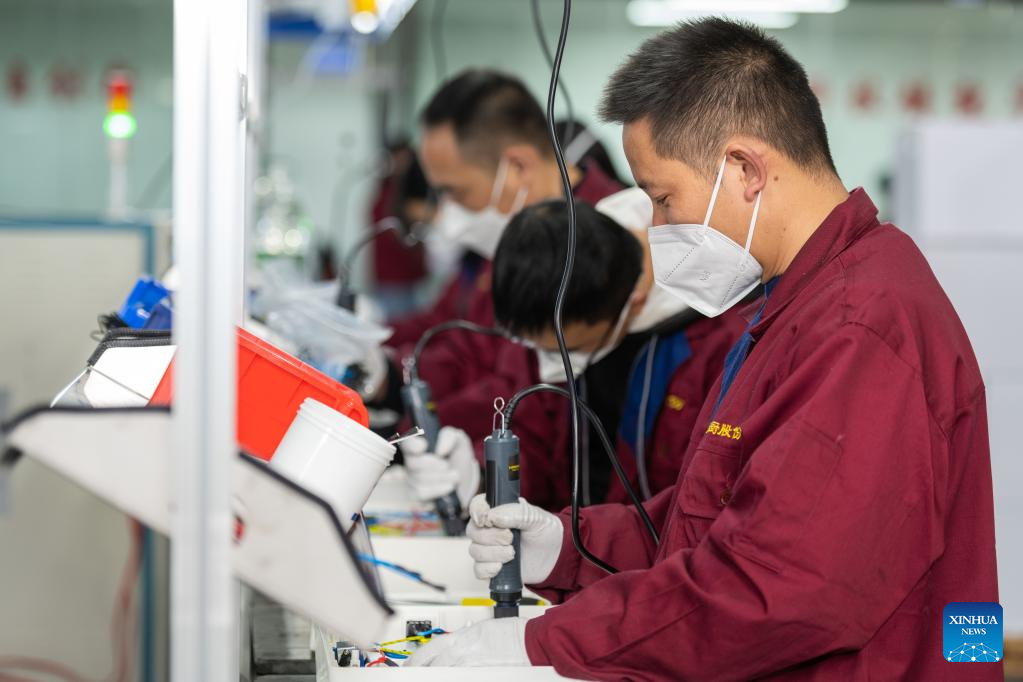 Workers work on an assembly line in a factory in Lhasa, southwest China's Tibet Autonomous Region, Nov. 27, 2022.(Xinhua/Zhou Dixiao)