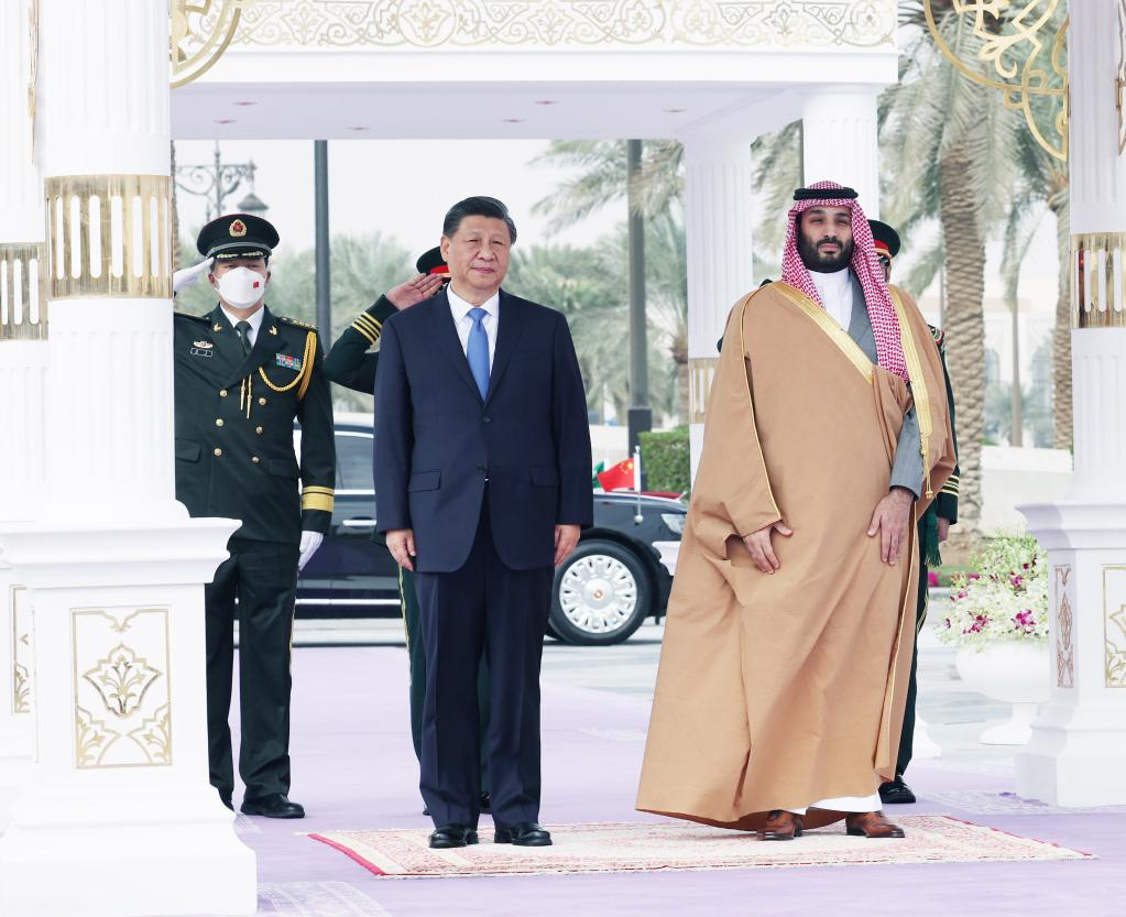 Chinese President Xi Jinping, who is paying a state visit to Saudi Arabia, attends a welcoming ceremony held by Saudi Crown Prince and Prime Minister Mohammed bin Salman Al Saud on behalf of King Salman bin Abdulaziz Al Saud at the royal palace in Riyadh, Saudi Arabia, Dec. 8, 2022. (Xinhua/Yao Dawei)