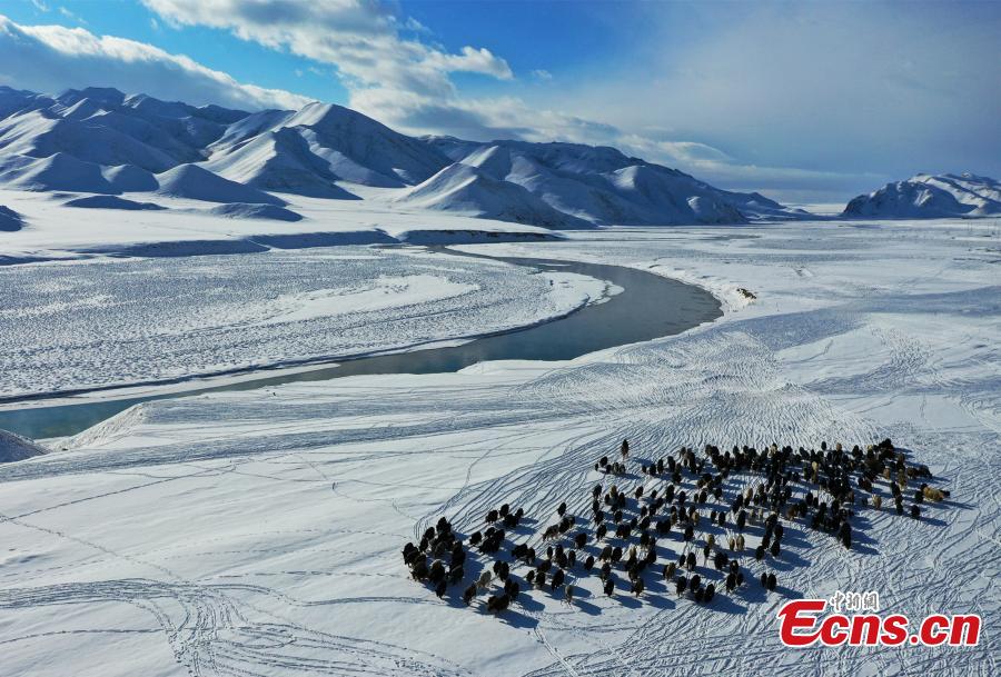 A herd of cattle graze on the snow-covered Bayanbulak grassland in Hejing County, northwest China's Xinjiang Uygur Autonomous Region. Snow turns the grassland into winter wonderland. (Photo: China News Service/Wang Fusheng)