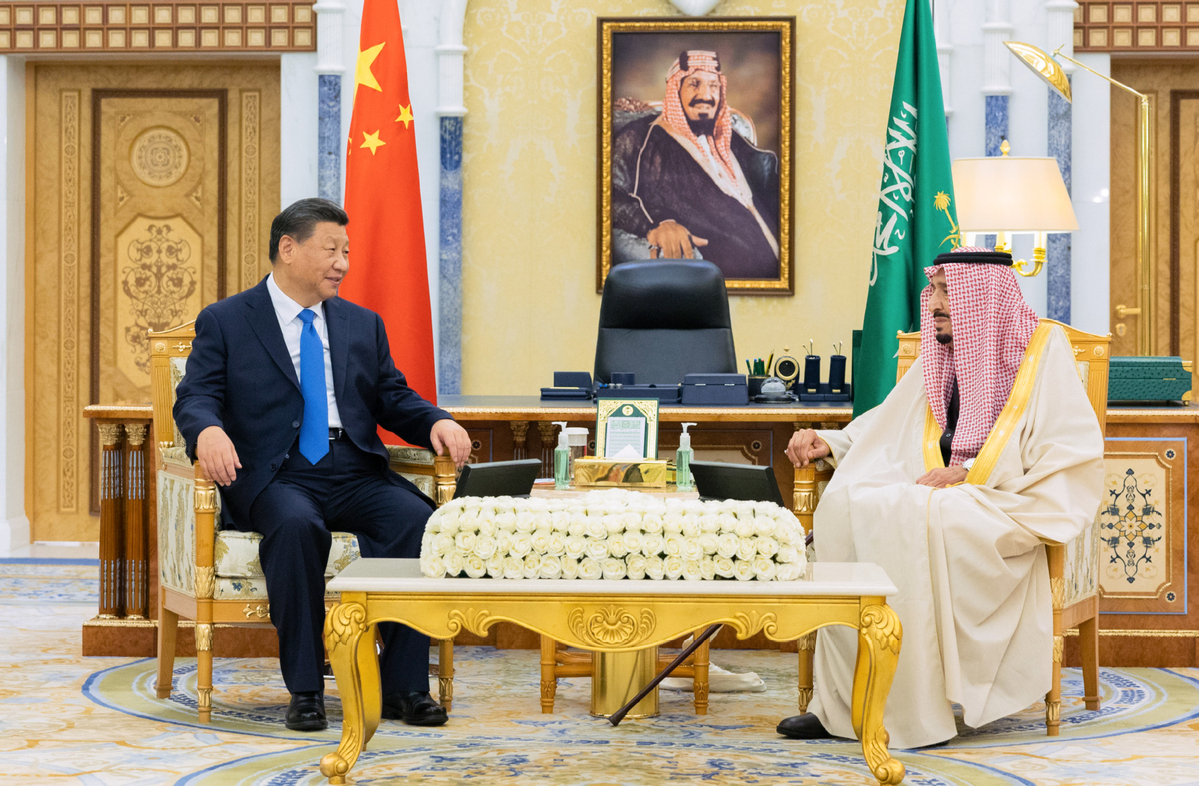 Chinese President Xi Jinping meets with King Salman bin Abdulaziz Al Saud of Saudi Arabia at Riyadh's al-Yamamah Palace in Saudi Arabia, Dec 8, 2022. [Photo/Xinhua]