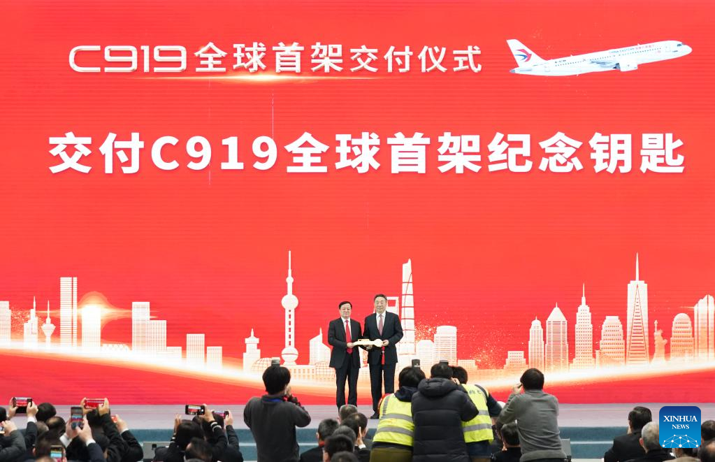 Commercial Aircraft Corporation of China (COMAC), the C919's developer, delivers a "commemorative key of the world's first C919" to China Eastern Airlines at the delivery ceremony of the world's first C919 jet in Shanghai, east China, Dec. 9, 2022. The first C919 large passenger aircraft was delivered to its first customer, China Eastern Airlines, on Friday. It is the first time ever for China's civil aviation transport market to have an indigenously-developed mainline jetliner. (Xinhua/Ding Ting)