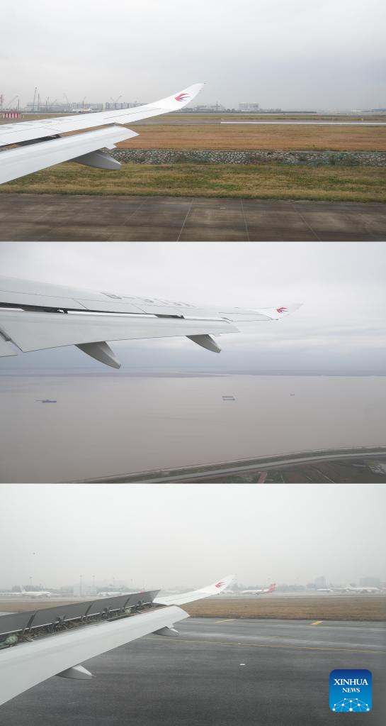 This combo photo shows the first C919 large passenger aircraft preparing to take off from Shanghai Pudong International Airport (top), the aircraft taking off from Shanghai Pudong International Airport (middle), and the aircraft landing at Shanghai Hongqiao International Airport (below), in Shanghai, east China, Dec. 9, 2022. The first C919 large passenger aircraft was delivered to its first customer, China Eastern Airlines, on Friday. It is the first time ever for China's civil aviation transport market to have an indigenously-developed mainline jetliner. (Xinhua/Ding Ting)