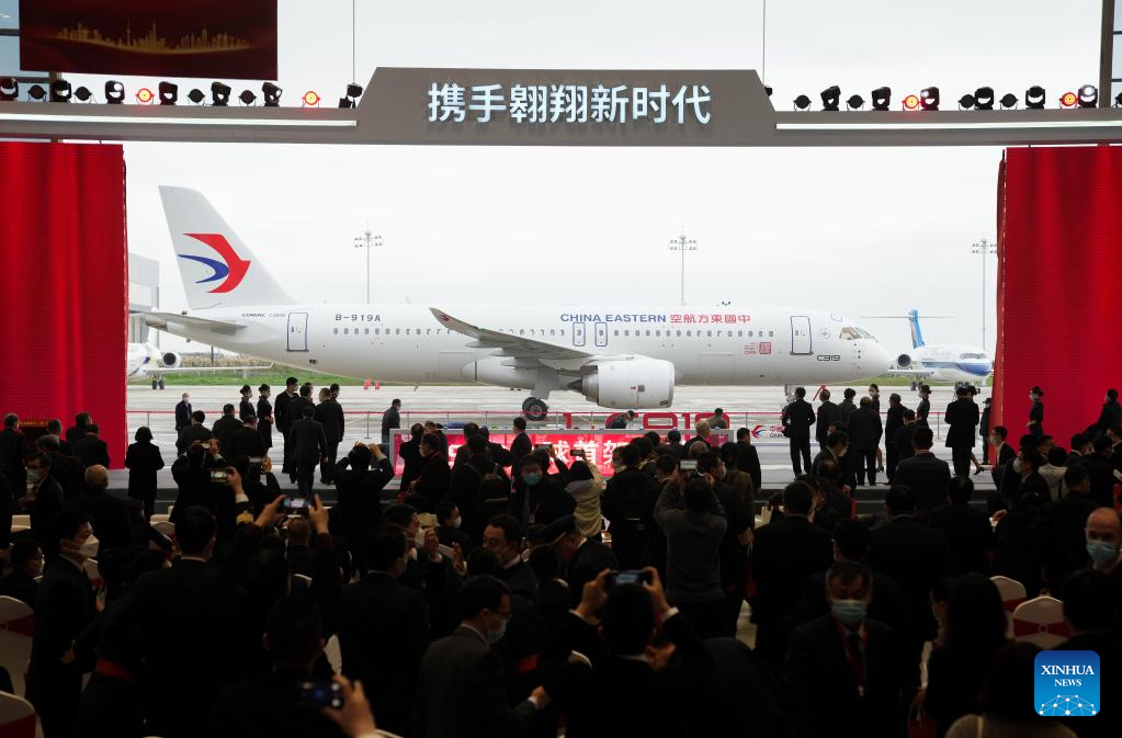 This photo taken on Dec. 9, 2022 shows the deliver ceremony of the first C919 large passenger aircraft in Shanghai, east China. The first C919 large passenger aircraft was delivered to its first customer, China Eastern Airlines, on Friday. It is the first time ever for China's civil aviation transport market to have an indigenously-developed mainline jetliner. (Xinhua/Ding Ting)