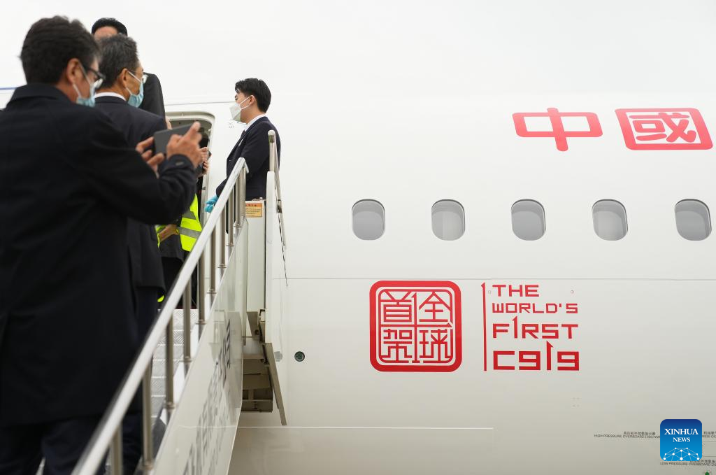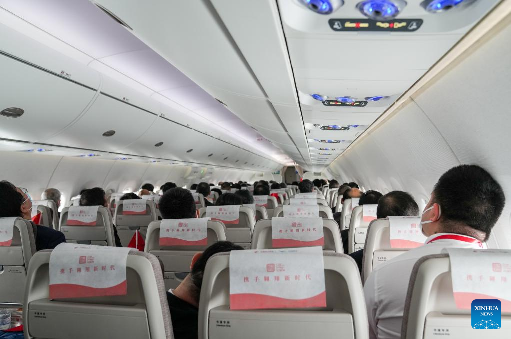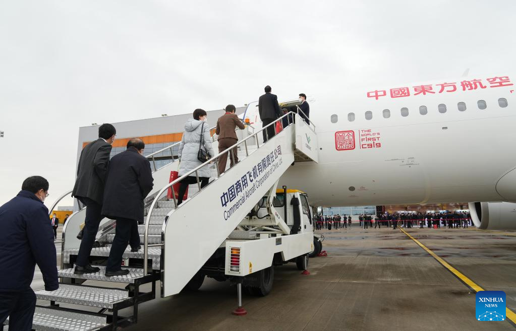 Passengers board the large aircraft C919 for its maiden flight from Shanghai Pudong International Airport to Shanghai Hongqiao International Airport in Shanghai, east China, Dec. 9, 2022. The first C919 large passenger aircraft was delivered to its first customer, China Eastern Airlines, on Friday. It is the first time ever for China's civil aviation transport market to have an indigenously-developed mainline jetliner. (Xinhua/Ding Ting)