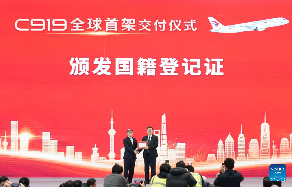 China Eastern Airlines receives the registration certificate from the Civil Aviation Administration of China (CAAC) East China Regional Administration at the delivery ceremony of the world's first C919 jet in Shanghai, east China, Dec. 9, 2022. The first C919 large passenger aircraft was delivered to its first customer, China Eastern Airlines, on Friday. It is the first time ever for China's civil aviation transport market to have an indigenously-developed mainline jetliner. (Xinhua/Ding Ting)