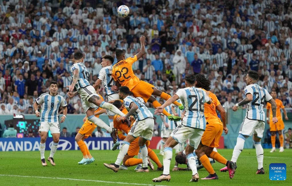 Nicolas Otamendi (top L) of Argentina heads the ball during the Quarterfinal between the Netherlands and Argentina of the 2022 FIFA World Cup at Lusail Stadium in Lusail, Qatar, Dec. 9, 2022. (Xinhua/Wang Lili)