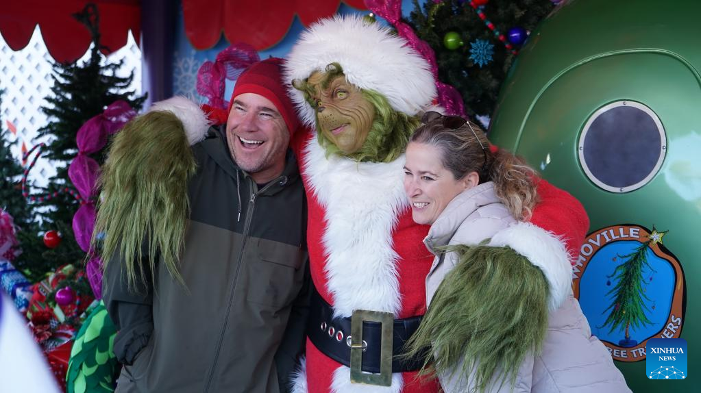 A staff member dressed as "the Grinch" interacts with tourists to celebrate the coming of Christmas at Universal Studios Hollywood in Los Angeles, the United States, on Dec. 8, 2022. Universal Studios Hollywood in Los Angeles is presenting a variety of holiday activities to attract tourists. (Photo by Zeng Hui/Xinhua)