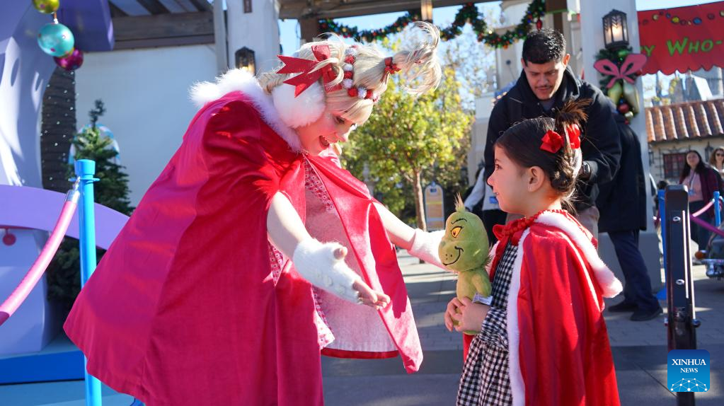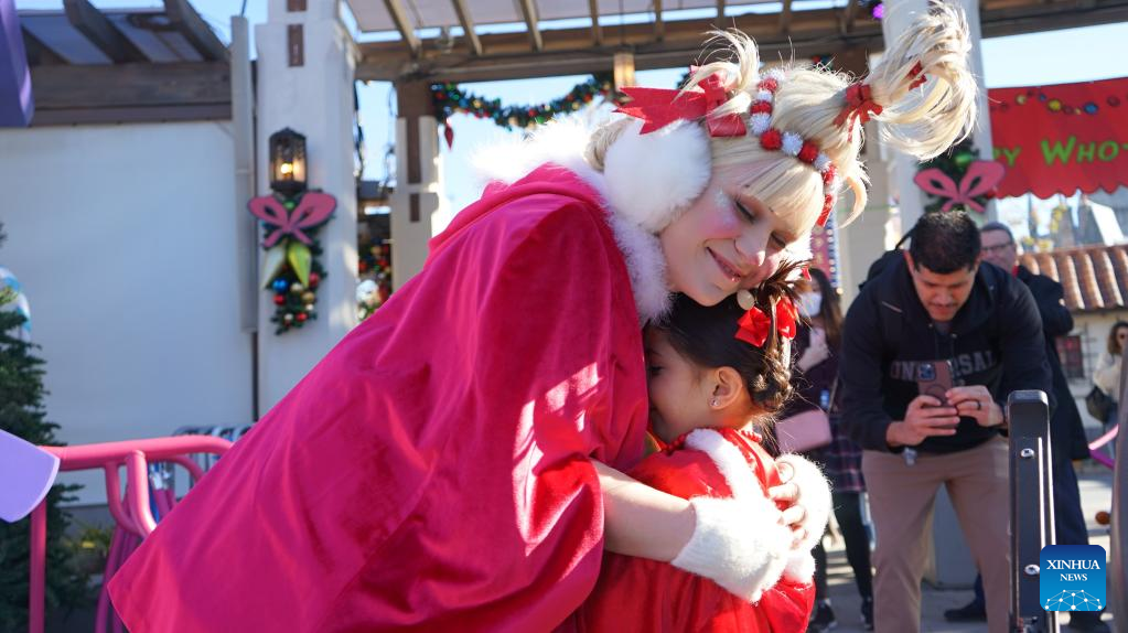 A staff member interacts with a girl during an activity to celebrate the coming of Christmas at Universal Studios Hollywood in Los Angeles, the United States, on Dec. 8, 2022. Universal Studios Hollywood in Los Angeles is presenting a variety of holiday activities to attract tourists. (Photo by Zeng Hui/Xinhua)