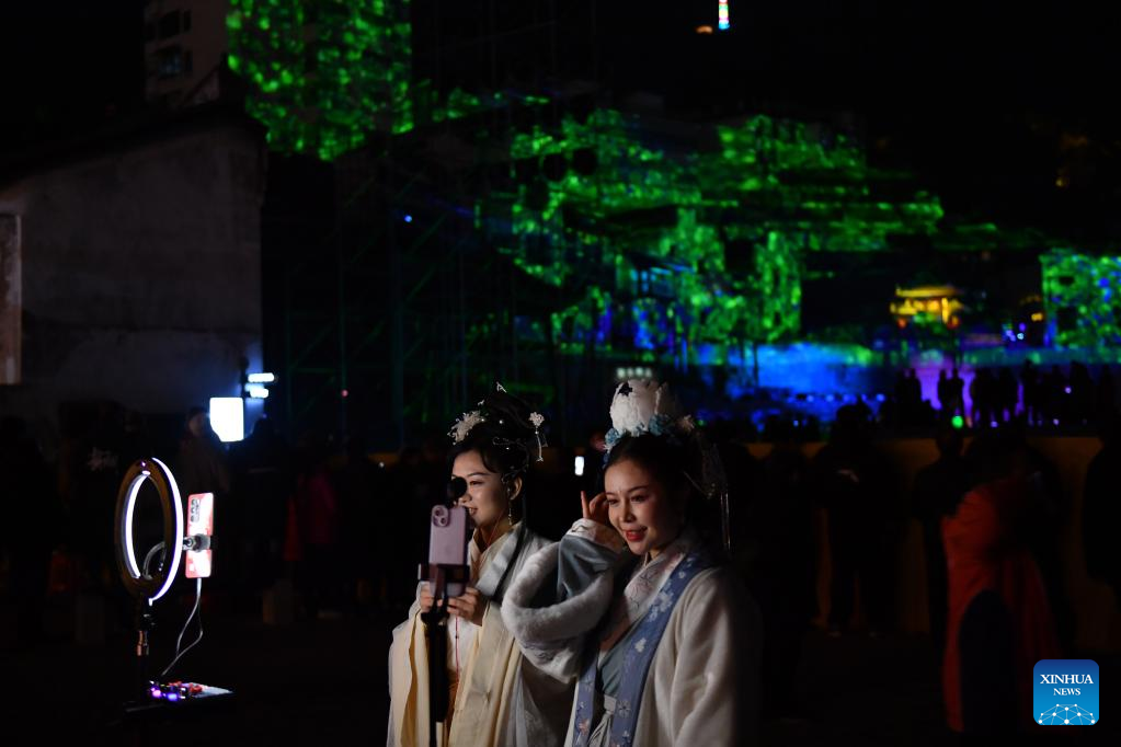 People do live streaming while visiting the Hongjiang ancient town in Huaihua, central China's Hunan Province, Dec. 9, 2022. Hongjiang ancient town has launched a variety of activities at nighttime to boost night economy. (Xinhua/Chen Zhenhai)