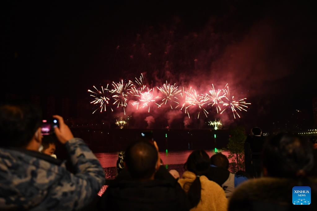 People watch a firework show in Hongjiang ancient town in Huaihua, central China's Hunan Province, Dec. 9, 2022. Hongjiang ancient town has launched a variety of activities at nighttime to boost night economy. (Xinhua/Chen Zhenhai)