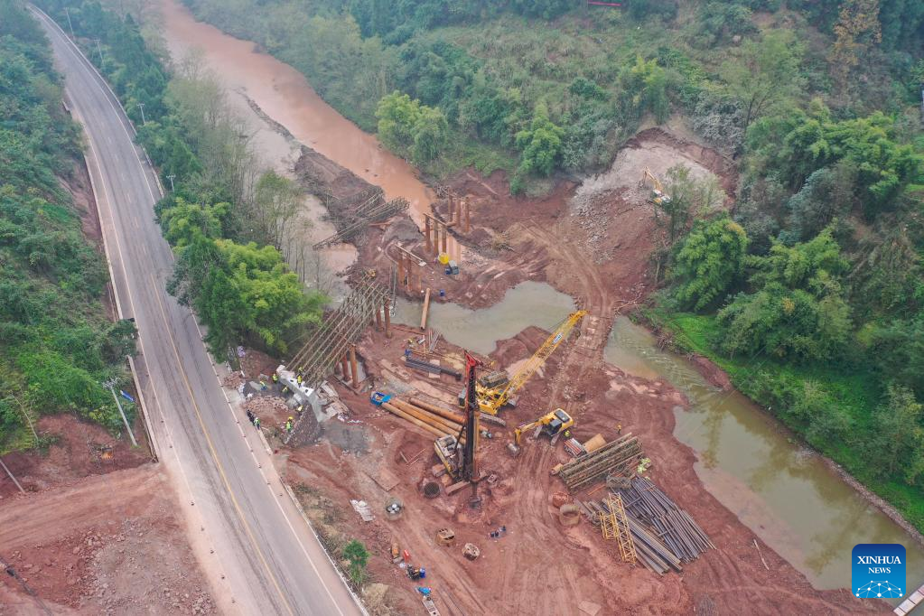 This aerial photo taken on Dec. 11, 2022 shows a bridge under construction at the Chongqing section of Chengdu-Dazhou-Wanzhou high-speed railway in southwest China's Chongqing Municipality. The Chongqing section of Chengdu-Dazhou-Wanzhou high-speed railway started construction on Sunday. (Xinhua/Tang Yi)