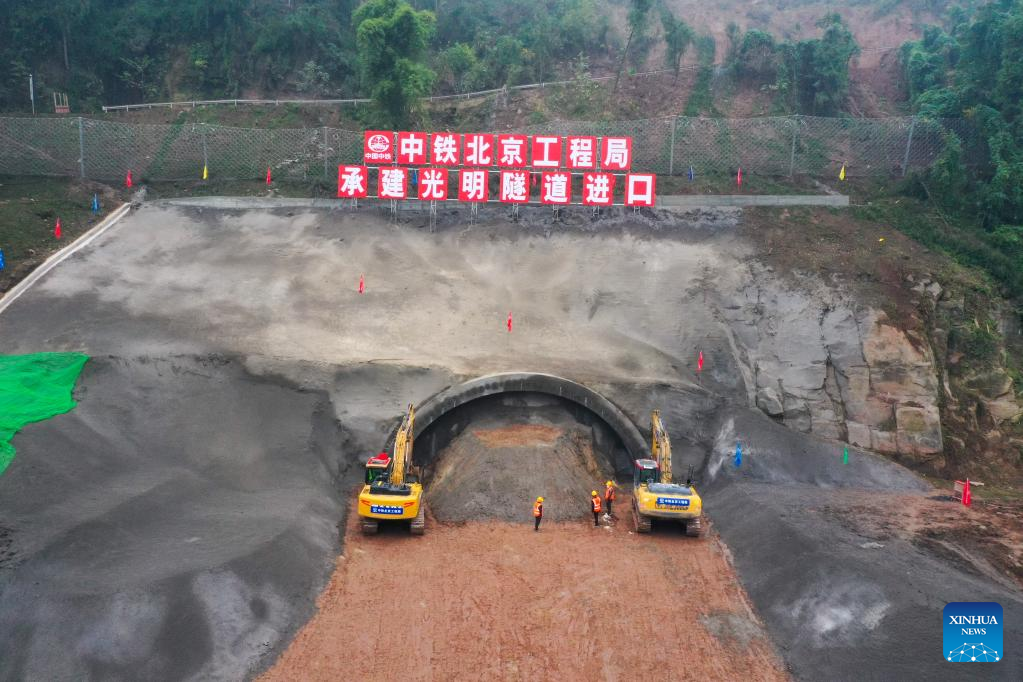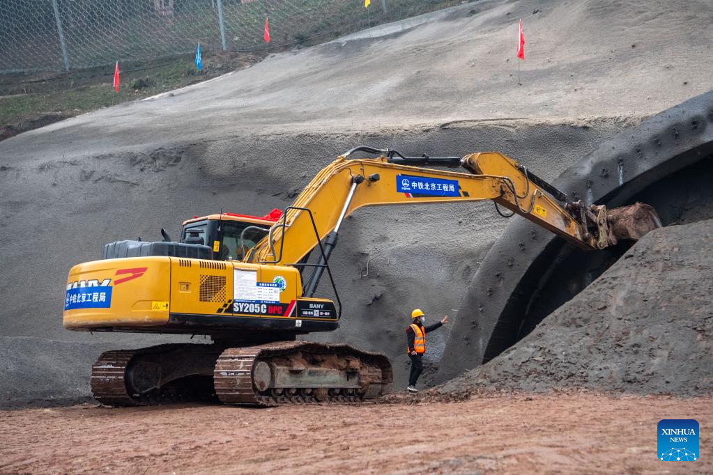 This photo taken on Dec. 11, 2022 shows a tunnel under construction at the Chongqing section of Chengdu-Dazhou-Wanzhou high-speed railway in southwest China's Chongqing Municipality. The Chongqing section of Chengdu-Dazhou-Wanzhou high-speed railway started construction on Sunday. (Xinhua/Tang Yi)