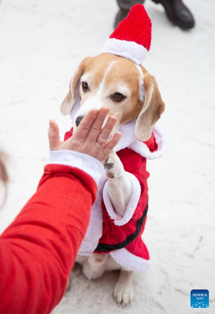 A dog dressed in Santa Claus costume is seen during the traditional Christmas Santa Claus charity run in Riga, Latvia, on Dec. 11, 2022. (Photo by Edijs Palens/Xinhua)