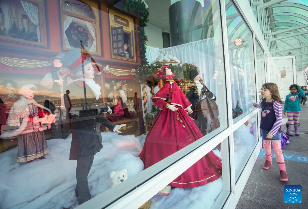 A girl looks at vintage Christmas window displays at Canada Place in Vancouver, British Columbia, Canada, on Dec. 12, 2022. The vintage Christmas window displays are now for viewing here as part of the Christmas highlights in Vancouver. (Photo by Liang Sen/Xinhua)
