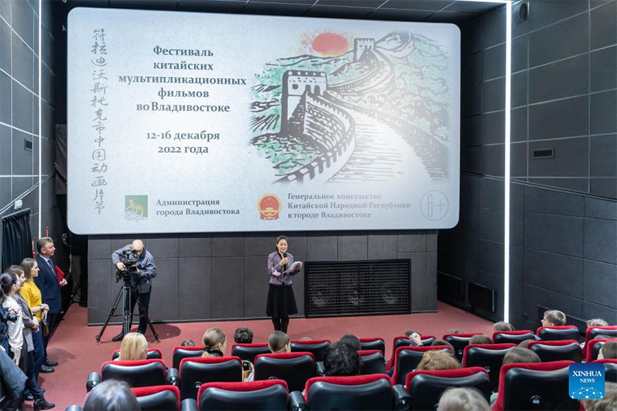 Pu Yangfan, the Chinese Consul General in Vladivostok, addresses the opening ceremony of the First Vladivostok Chinese Cartoon Festival in Vladivostok, Russia, Dec. 12, 2022. The First Vladivostok Chinese Cartoon Festival opened in Vladivostok on Monday. Three Chinese animated films are screened at two local venues for a period of one week. (Photo by Guo Feizhou/Xinhua)