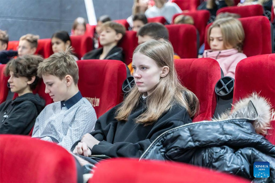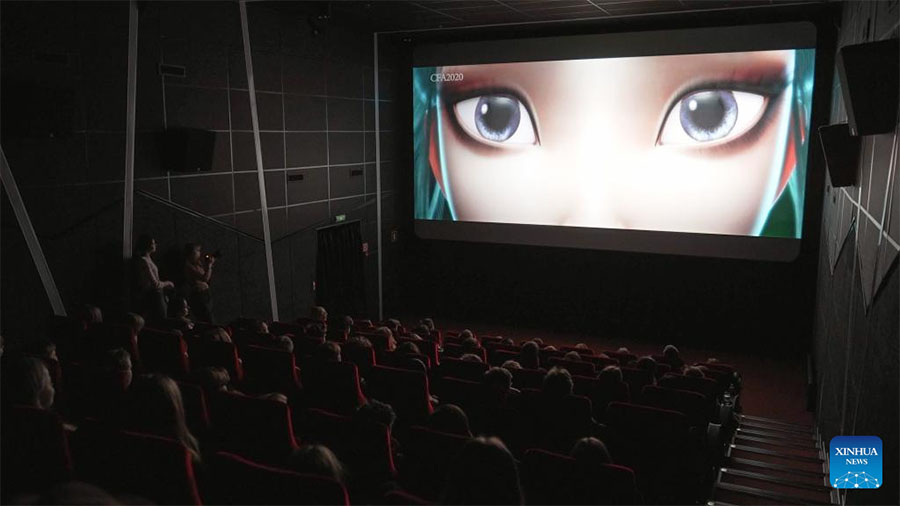 This video grab shows people watch the Chinese cartoon "White Snake" at a movie theater during the First Vladivostok Chinese Cartoon Festival in Vladivostok, Russia, Dec. 12, 2022. The First Vladivostok Chinese Cartoon Festival opened in Vladivostok on Monday. Three Chinese animated films are screened at two local venues for a period of one week. (Photo by Guo Feizhou/Xinhua)