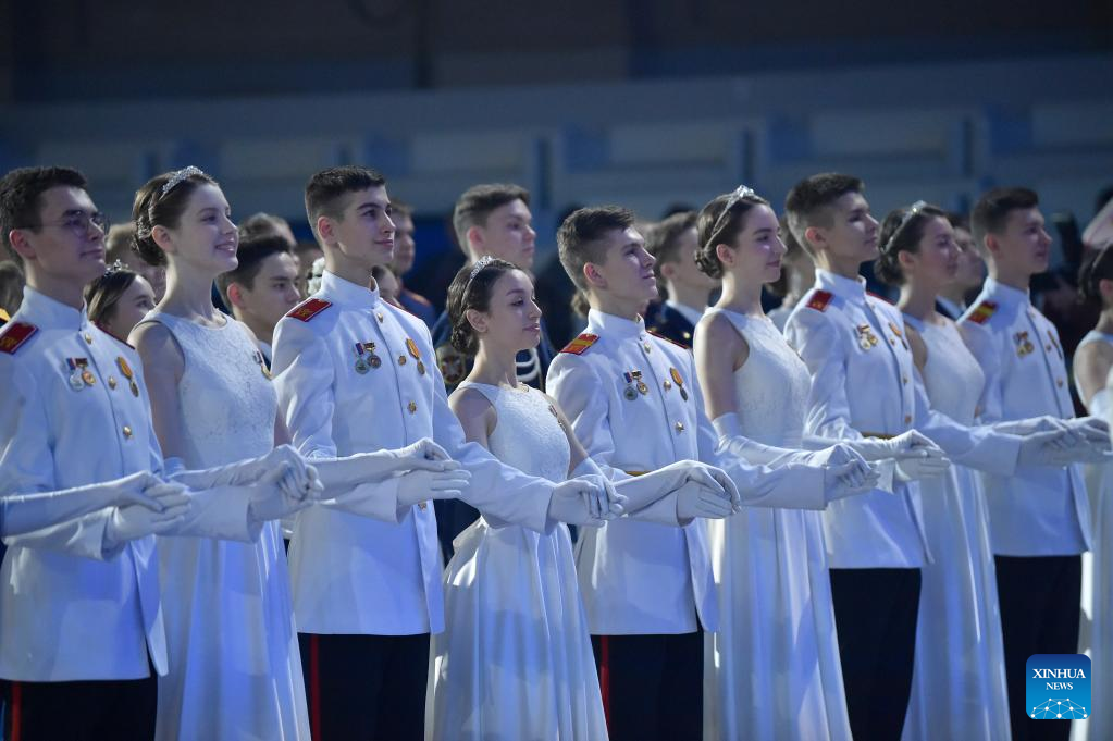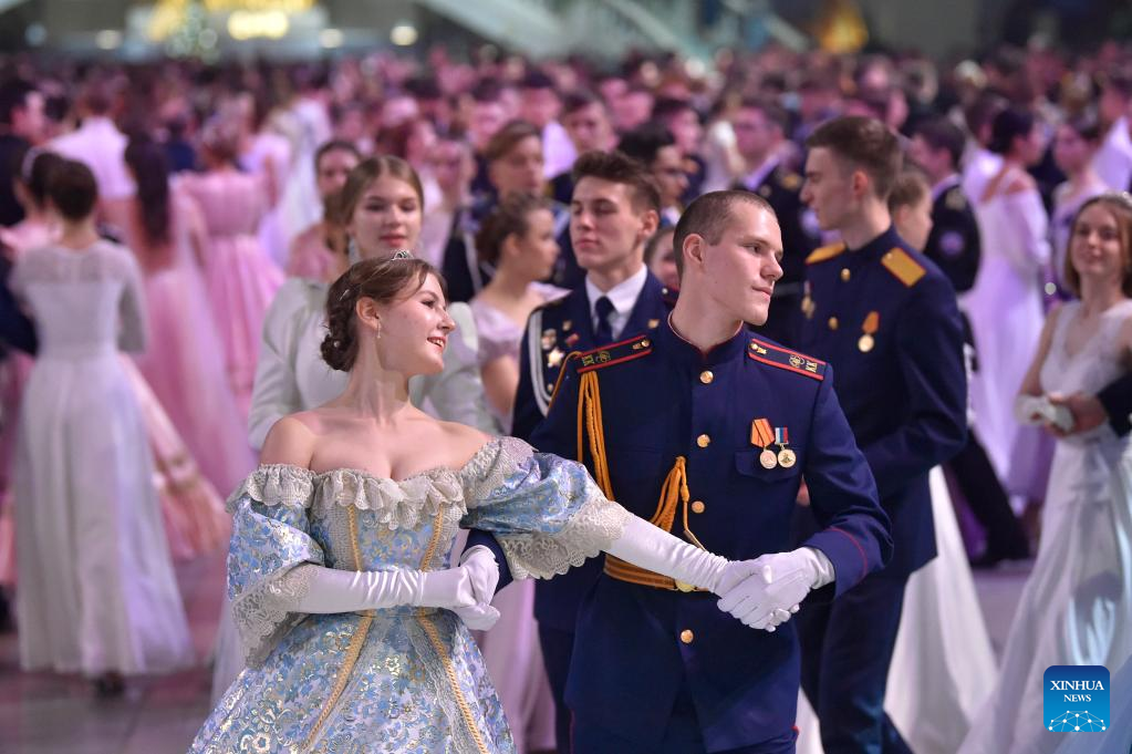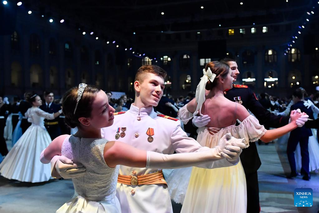 Participants dance during the International Charity Cadet Ball in Moscow, Russia, on Dec. 13, 2022. (Photo by Alexander Zemlianichenko Jr/Xinhua)
