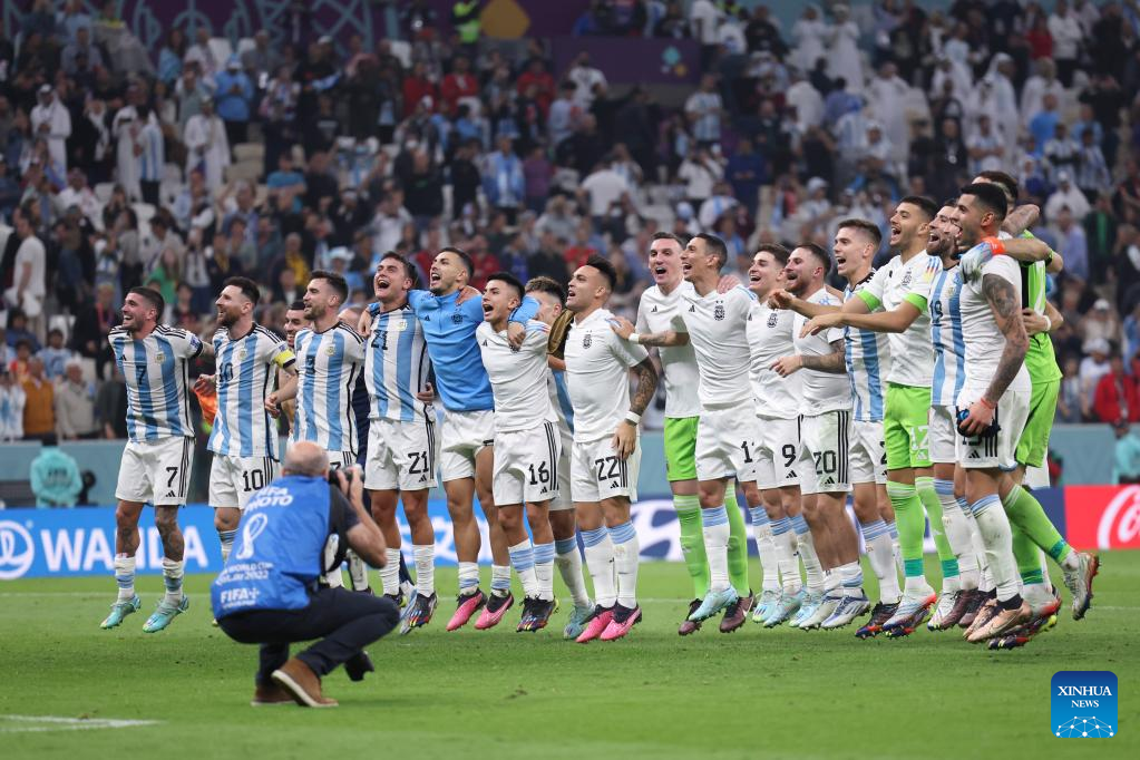 Players of Argentina celebrates winning the Semifinal between Argentina and Croatia at the 2022 FIFA World Cup at Lusail Stadium in Lusail, Qatar, Dec. 13, 2022. (Xinhua/Cao Can)