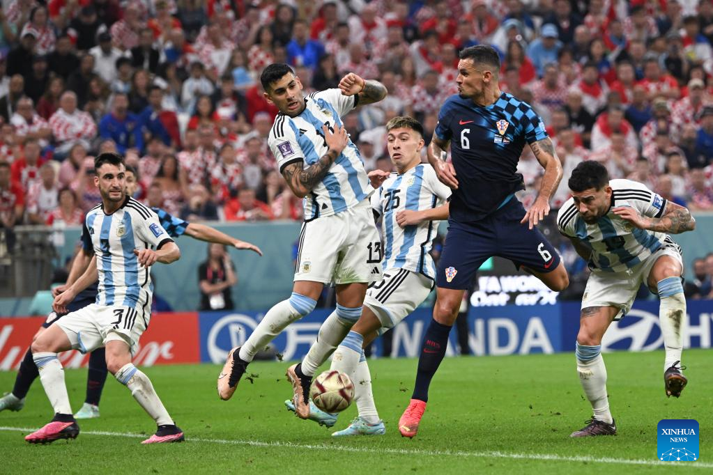Dejan Lovren (2nd R) of Croatia vies for the ball during the Semifinal between Argentina and Croatia at the 2022 FIFA World Cup at Lusail Stadium in Lusail, Qatar, Dec. 13, 2022. (Xinhua/Li Ga)