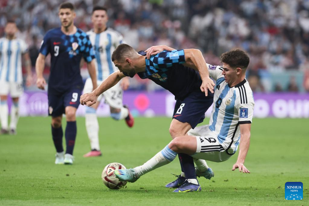 Julian Alvarez (R) of Argentina vies with Mateo Kovacic of Croatia during the Semifinal between Argentina and Croatia at the 2022 FIFA World Cup at Lusail Stadium in Lusail, Qatar, Dec. 13, 2022. (Xinhua/Lan Hongguang)