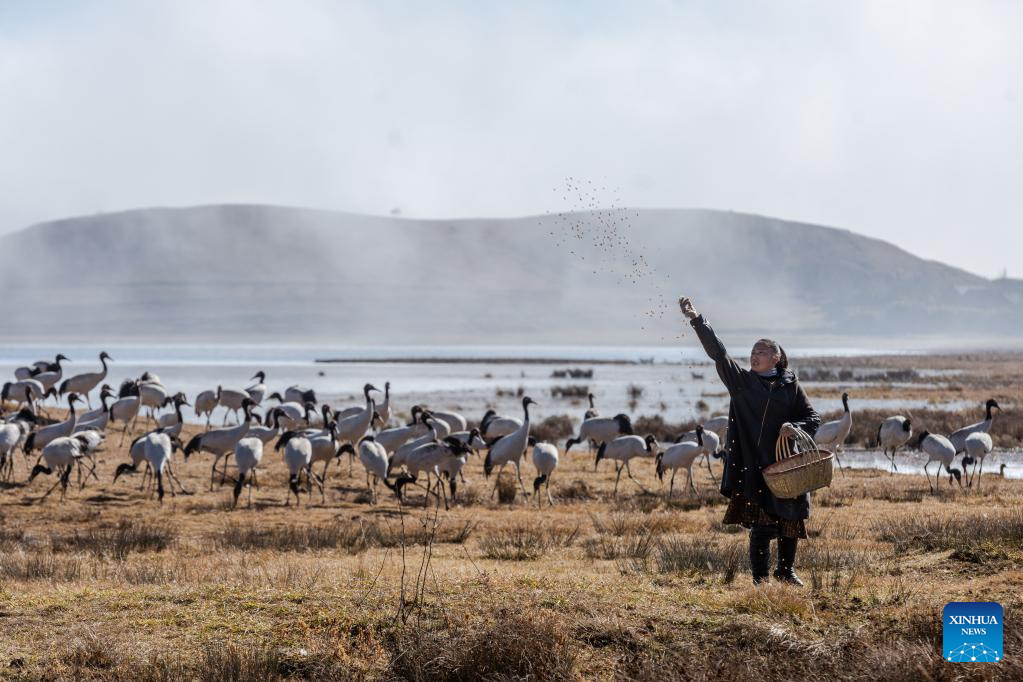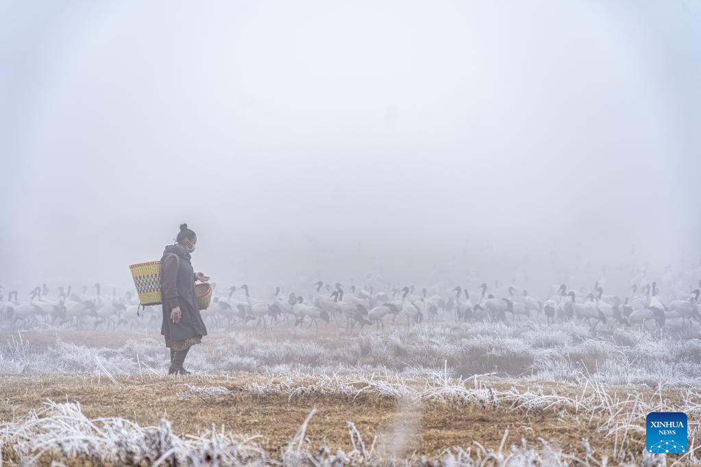 Chen Guanghui feeds black-necked cranes at Yunnan Dashanbao National Nature Reserve for Black-necked Cranes in Zhaotong, southwest China's Yunnan Province, Dec. 10, 2022. Yunnan Dashanbao National Nature Reserve for Black-necked Cranes, located in Zhaoyang District of Zhaotong City, is the most significant wintering habitat and transfer station for migratory black-necked cranes on the Yunnan-Guizhou Plateau.