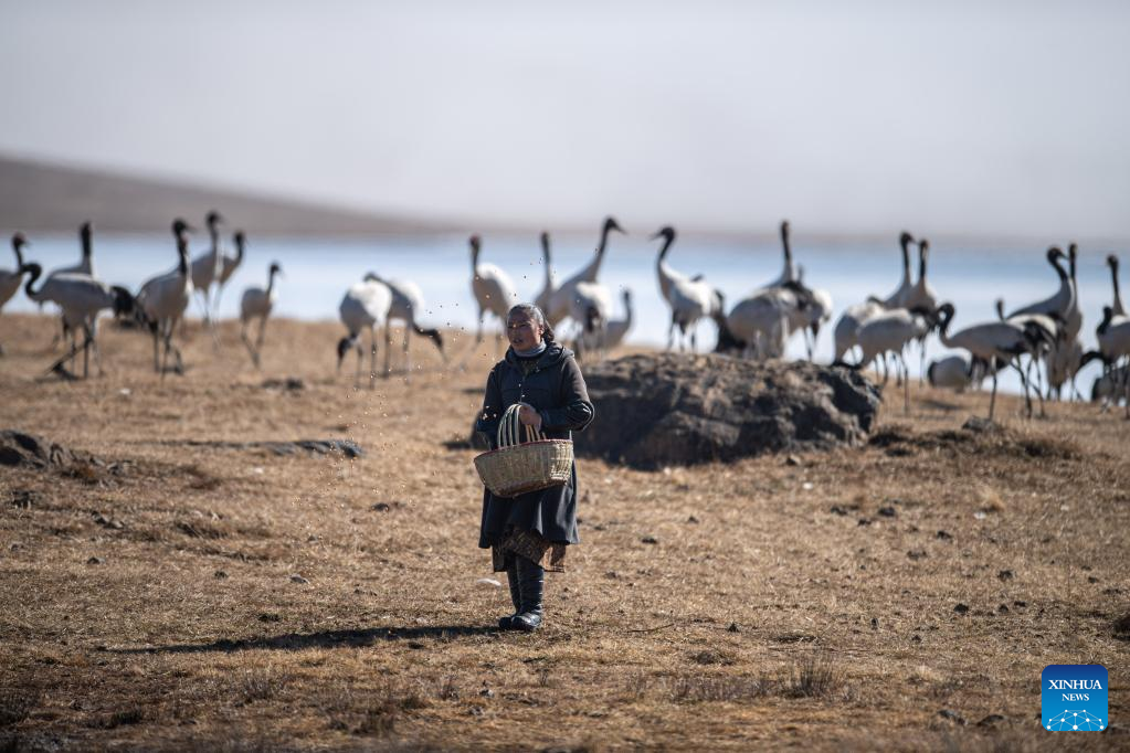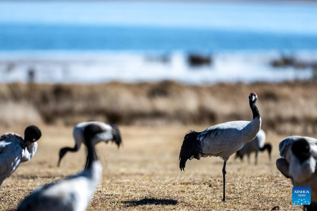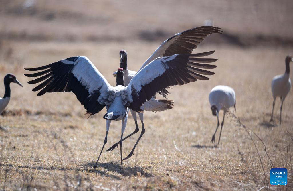 Over recent years, the reserve has made a determined effort to implement conservation measures, such as wetland protection and restoration and construction of food source bases, in order to steadily improve its ecological environment for migratory birds. During the past three years, an average of over 1,500 black-necked cranes were spotted arriving at the reserve for wintering. (Xinhua/Cao Mengyao)