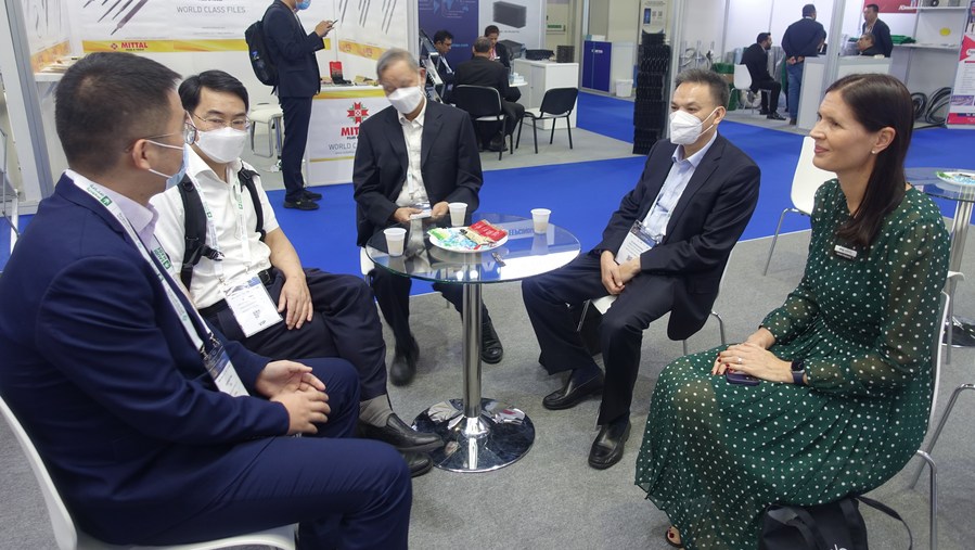 Representatives of enterprises from China's Zhejiang Province hold business talks with merchants in Dubai, United Arab Emirates, Dec. 8, 2022. (Xinhua)
