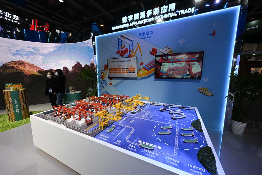 This photo taken on Dec. 12, 2022 shows a smart port system on display during the first Global Digital Trade Expo in Hangzhou, east China's Zhejiang Province. (Xinhua/Xu Yu)