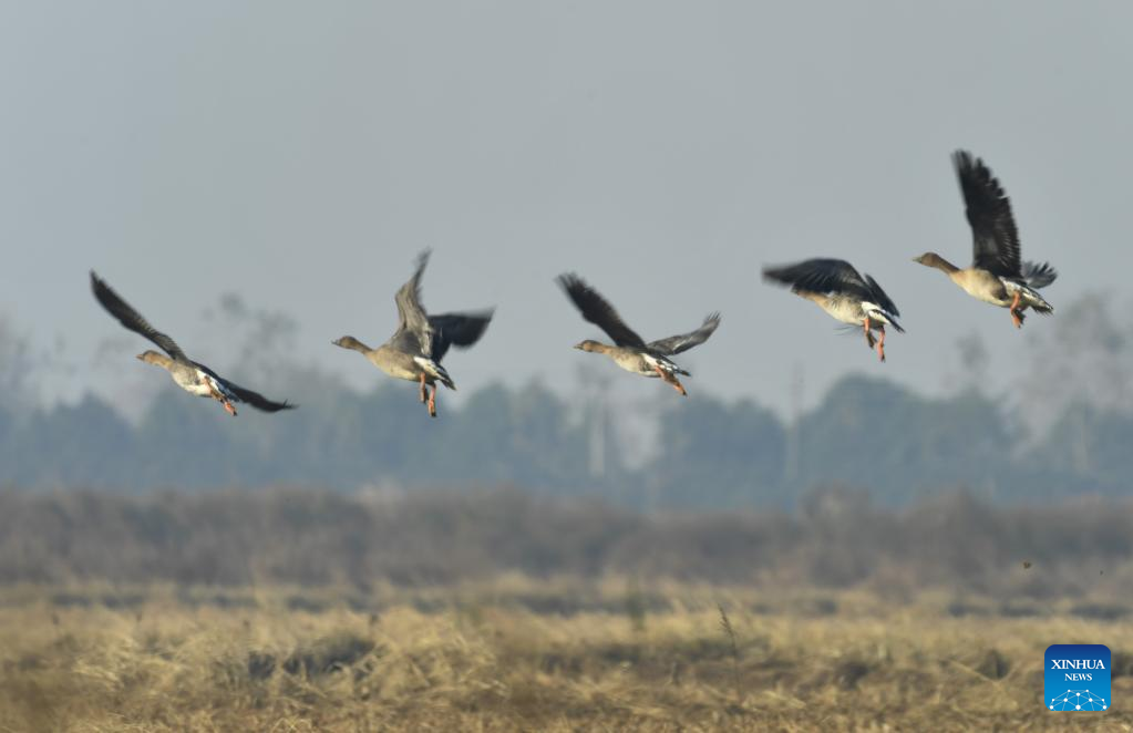 This photo taken on Dec. 13, 2022 shows bean geese at Donggu Lake wetland of the Quyuan administration area, central China's Hunan Province. (Xinhua/Zhao Zhongzhi)