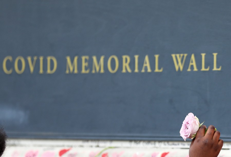 A woman puts a flower on the National COVID Memorial Wall in London, Britain, March 27, 2022. (Xinhua/Li Ying)