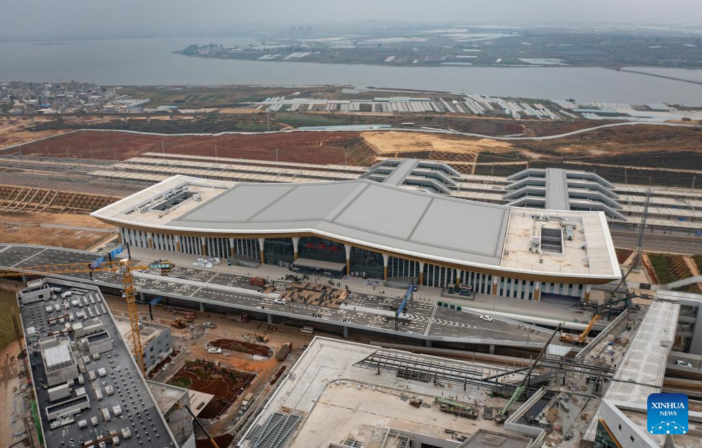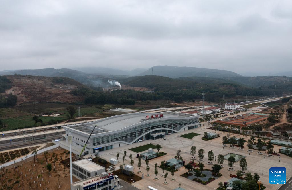 This aerial photo taken on Dec. 14, 2022 shows Kaiyuannan Railway Station of Mile-Mengzi high-speed railway in southwest China's Yunnan Province. (Xinhua/Wang Guansen)