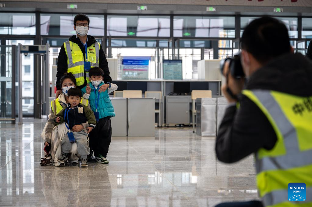 A railway constructor and his family members pose for a photo at Honghe Railway Station of Mile-Mengzi high-speed railway in southwest China's Yunnan Province, Dec. 14, 2022. (Xinhua/Wang Guansen)
