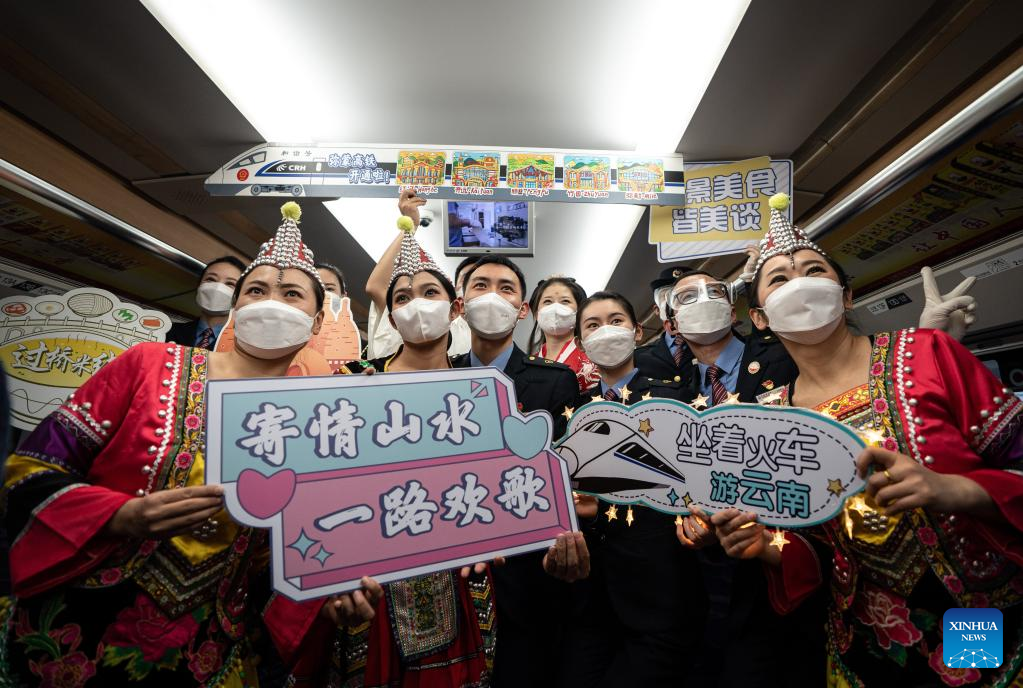Conductors pose for a photo on a trial running train of Mile-Mengzi high-speed railway in southwest China's Yunnan Province, Dec. 14, 2022. (Xinhua/Wang Guansen)