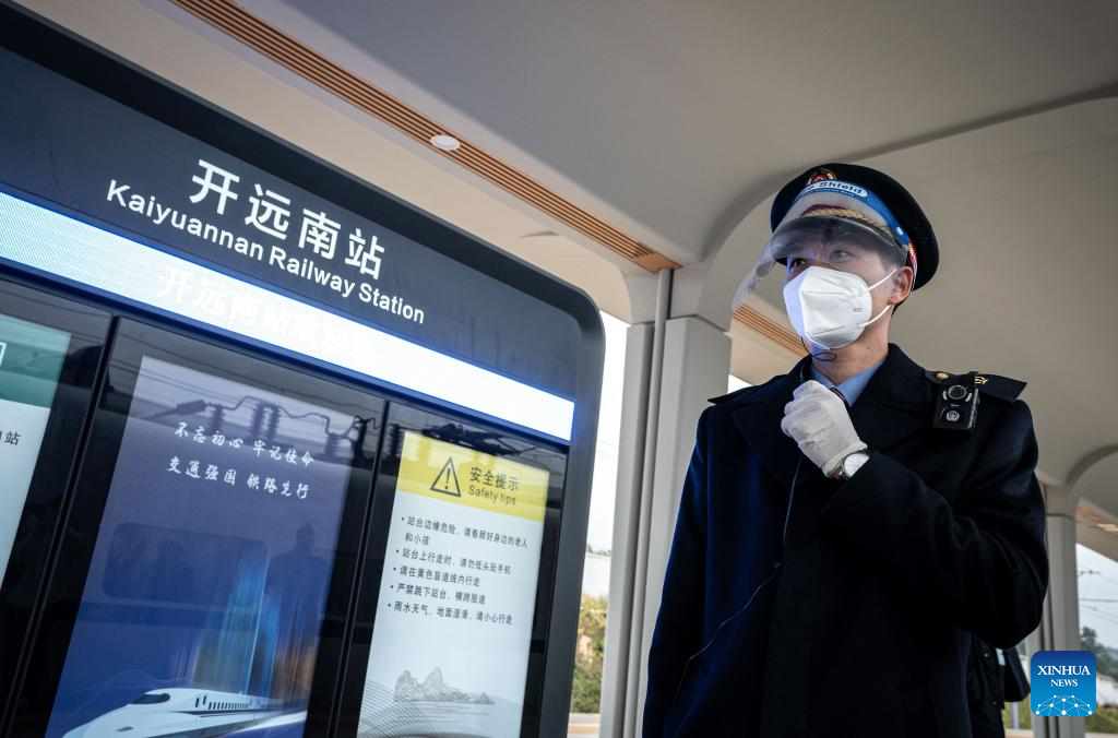 A railway staff member works at Kaiyuannan Railway Station of Mile-Mengzi high-speed railway in southwest China's Yunnan Province, Dec. 14, 2022. (Xinhua/Wang Guansen)