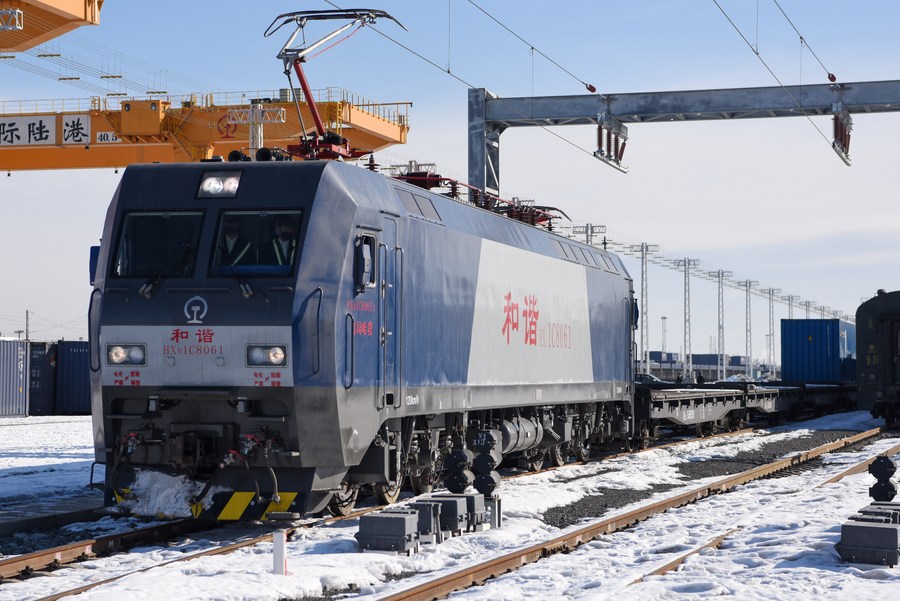 A freight train pulls out of the China-Europe Railway Express Hub in Urumqi, capital of northwest China's Xinjiang Uygur Autonomous Region, Feb. 20, 2020. (Xinhua/Ding Lei)