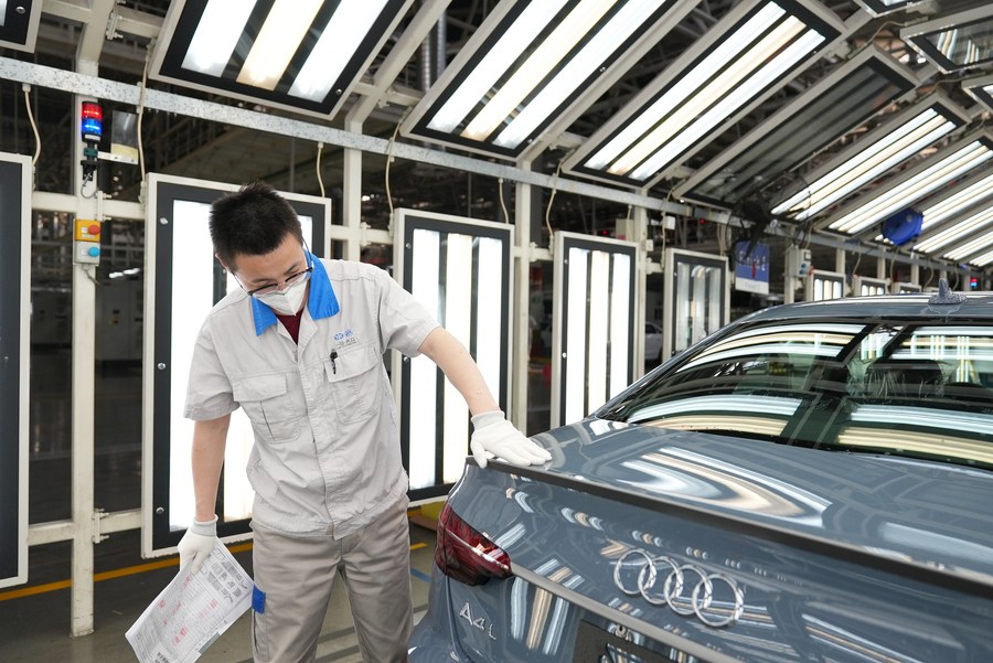 A worker checks a vehicle at the assembly line of FAW-Volkswagen in Changchun, northeast China's Jilin Province, May 16, 2022. (Xinhua)