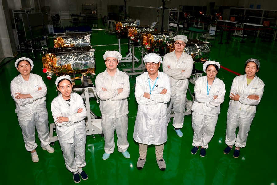 Technicians of the Jilin-1 Gaofen 03 satellites pose for a photo at a workshop of Chang Guang Satellite Technology Co., Ltd. in northeast China's Jilin Province, Aug. 3, 2022. (Xinhua/Xu Chang)