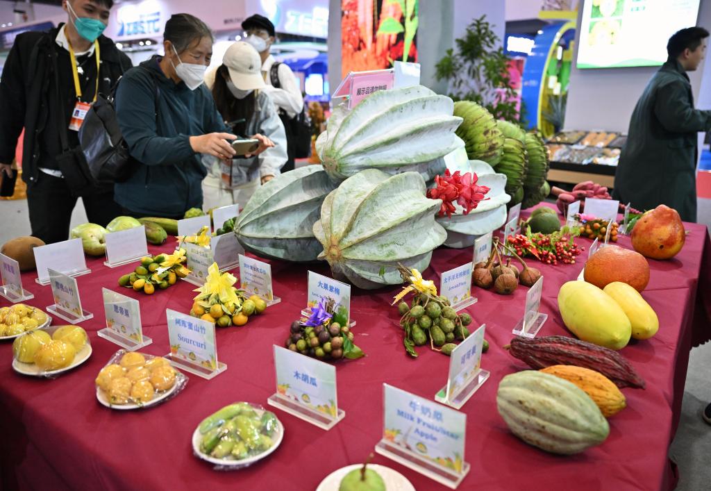 Visitors view tropical fruits at the 2022 China (Hainan) International Tropical Agricultural Products Winter Trade Fair in Haikou, south China's Hainan Province, Dec. 15, 2022. (Xinhua/Guo Cheng)