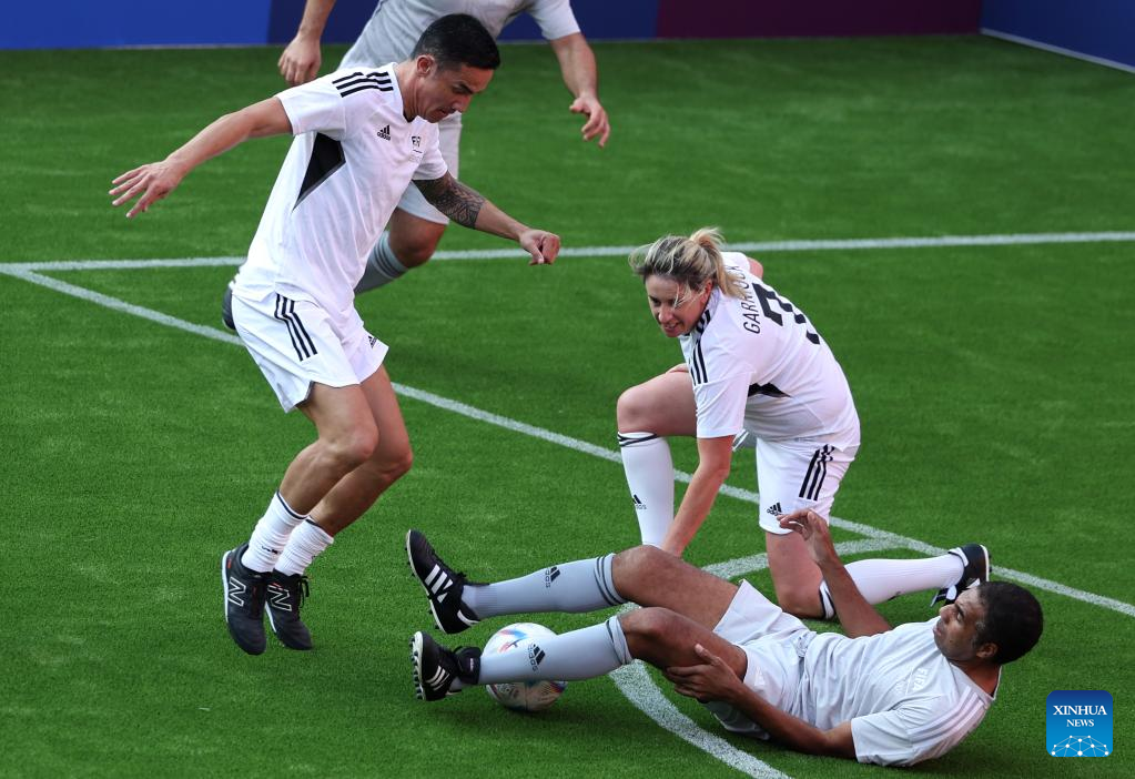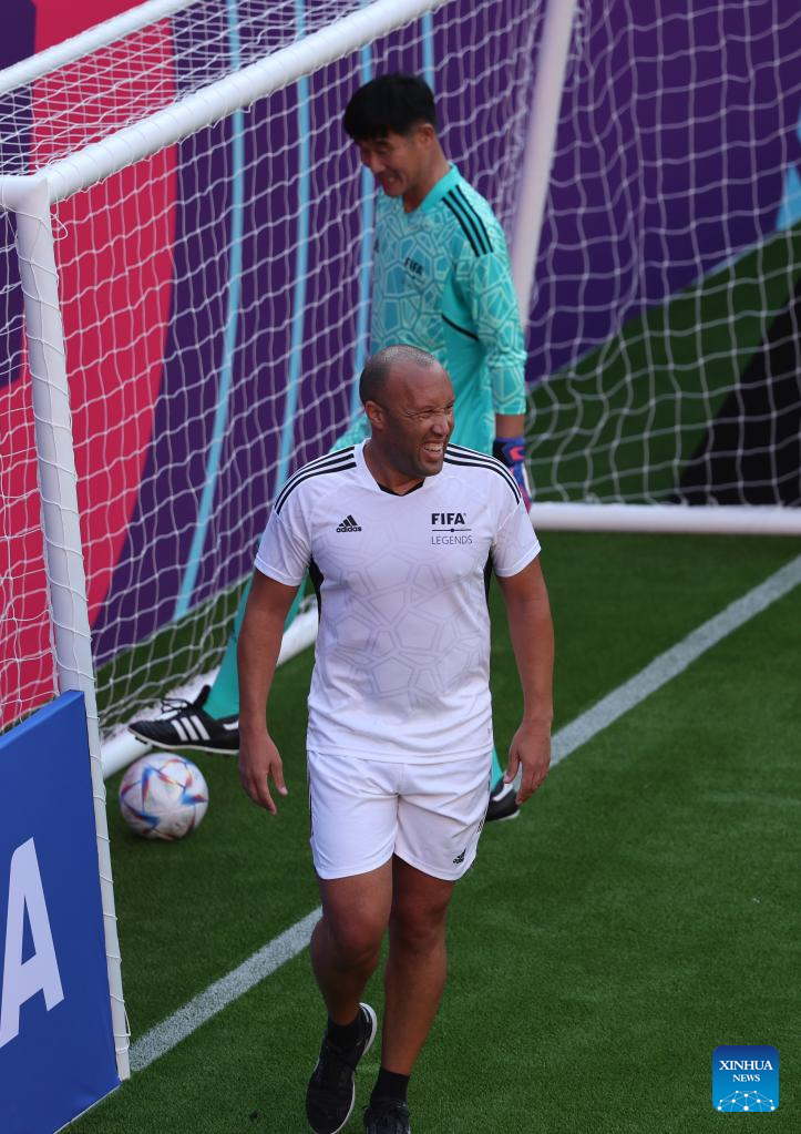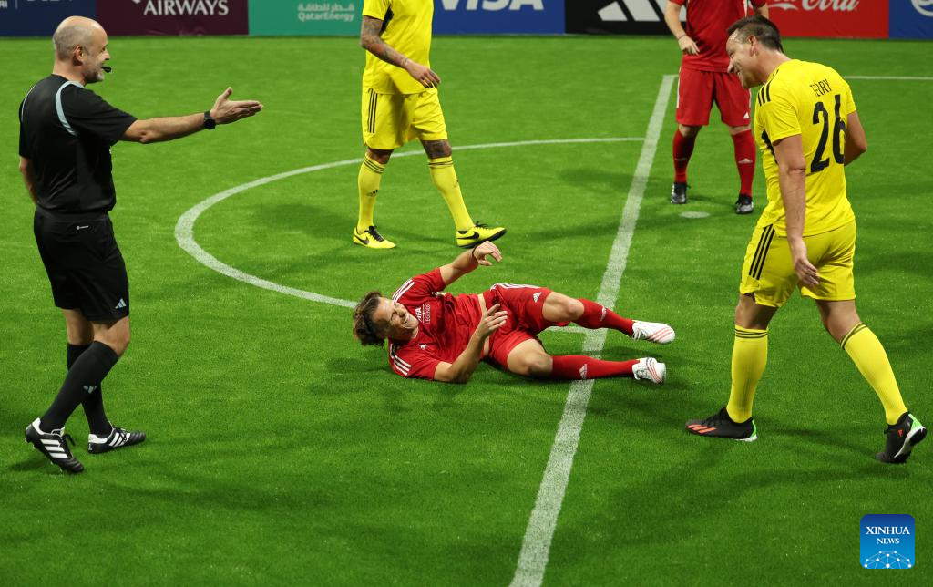 France's legend Mikael Silvestre (front) reacts during the FIFA Legends Cup at the Khalifa International Tennis &Squash Complex in Doha, Qatar, Dec. 15, 2022. (Xinhua/Jia Haocheng)