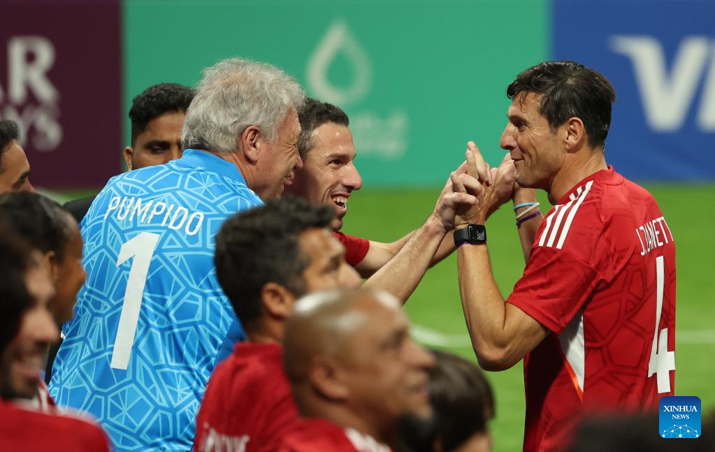 Argentina's former football player Javier Zanetti (1st R) celebrates with teammates after the FIFA Legends Cup at the Khalifa International Tennis &Squash Complex in Doha, Qatar, Dec. 15, 2022. (Xinhua/Jia Haocheng)