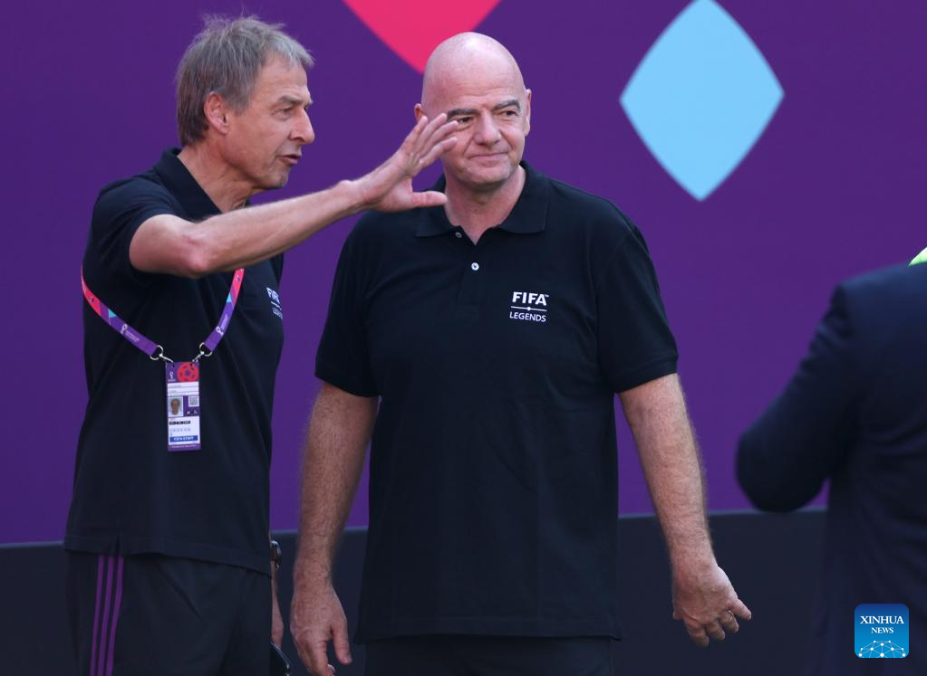 FIFA's Technical Study Group member Jurgen Klinsmann (L) communicates with FIFA president Gianni Infantino during the FIFA Legends Cup at the Khalifa International Tennis &Squash Complex in Doha, Qatar, Dec. 15, 2022. (Xinhua/Jia Haocheng)