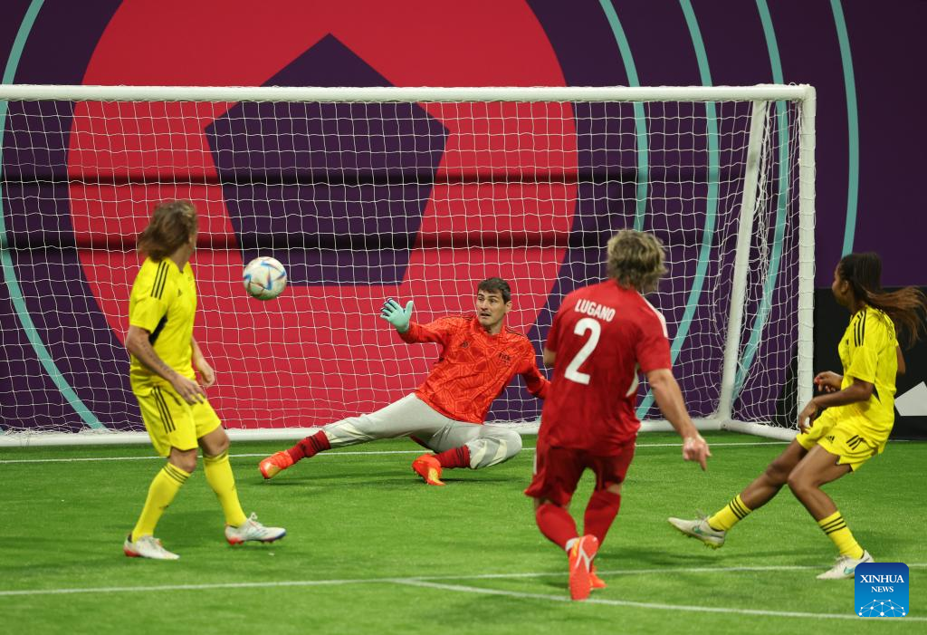 Spain's former goalkeeper Iker Casillas (2nd L) makes a save during the FIFA Legends Cup at the Khalifa International Tennis &Squash Complex in Doha, Qatar, Dec. 15, 2022. (Xinhua/Jia Haocheng)