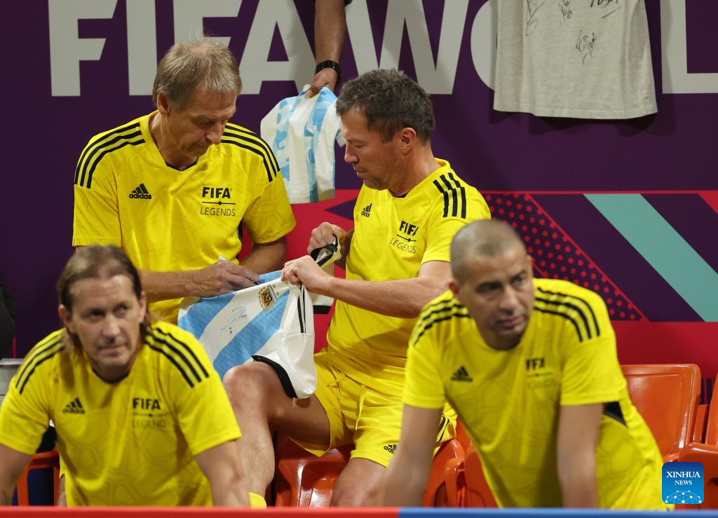 Germany's former football player Jurgen Klinsmann (top L) signs autographs for fans during the FIFA Legends Cup at the Khalifa International Tennis &Squash Complex in Doha, Qatar, Dec. 15, 2022. (Xinhua/Jia Haocheng)