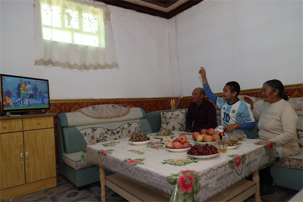Abduhalik Hemdulla watches the 2022 FIFA World Cup with his parents. (People’s Daily Online/courtesy of the publicity department of the CPC Kashgar Prefectural Committee)