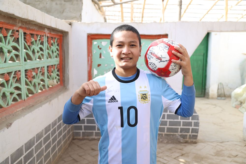 Photo shows 14-year-old Abduhalik Hemdulla showing off a jersey and a football given by Lionel Messi. (People’s Daily Online/courtesy of the publicity department of the CPC Kashgar Prefectural Committee)