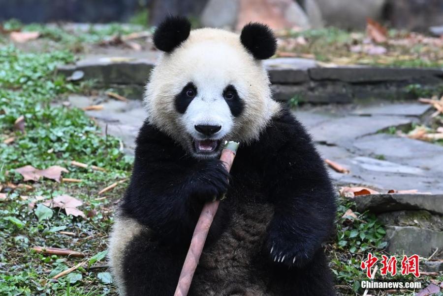 A giant panda eats a bamboo shoot at the Dujiangyan base of the China Conservation and Research Center for Giant Panda, southwest China's Sichuan Province, Dec. 15, 2022. (Photo: China News Service/An Yuan)
